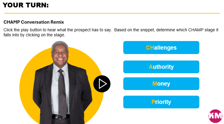 Learners listen to a series of snippets from a sales conversation with a prospect. For each snippet, learners determine which stage in the CHAMP framework it falls under by clicking on the stage. Incorrect answers prompt a Try Again message. Articulate Storyline mock up only for portfolio purposes.